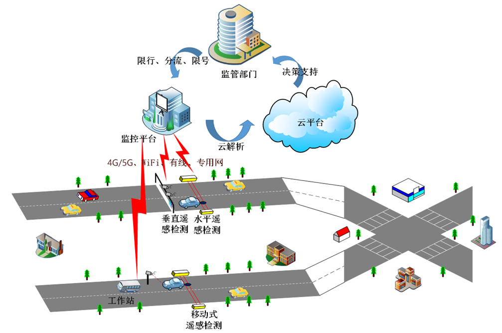 針對城市道路機動車保有量迅速攀升、尾氣排放污染日益嚴峻、環(huán)境保護管控壓力不斷增加的狀況,結合城市高污染排放車輛治理淘汰工作要求,采用非分散紅外、色散紫外氣體檢測、圖像智能識別、網(wǎng)絡通訊、物聯(lián)網(wǎng)+等先進技術,將機動車尾氣遙感監(jiān)測、黑煙車抓拍、道路環(huán)境空氣質量監(jiān)測等融為一體,構建完整的機動車尾氣污染監(jiān)控解決方案,該解決方案滿足《汽車污染物排放限值及測量方法遙感檢測法》,同時采用機器學習、深度學習等大數(shù)據(jù)處理和分析技術,對機動車尾氣排放相關數(shù)據(jù)進行智能處理和數(shù)據(jù)挖掘,獲取最具辨識力的關鍵性指標和統(tǒng)計數(shù)據(jù),為環(huán)境監(jiān)管部門提供高效的監(jiān)測技術保障和實時有效的監(jiān)測數(shù)據(jù)。