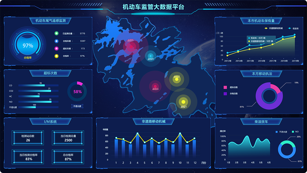 機動車等移動源污染已成為我國大氣污染的重要來源,對我國能源與環(huán)境帶來巨大壓力。機動車環(huán)保大數(shù)據(jù)平臺解決方案從污染源頭進行設(shè)計,基于統(tǒng)一的時空基準(zhǔn)建立彈性空間數(shù)據(jù)庫,將尾氣遙感監(jiān)測、非道路移動機械信息管理、機動車檢測與維修(I/M)、柴油貨車在線管理和冒黑煙車抓拍系統(tǒng)等功能融為一體,充分結(jié)合在線WebGIS技術(shù)、大數(shù)據(jù)場景下的信息分析和空間可視化技術(shù),通過“一張圖”或大數(shù)據(jù)看板的形式展現(xiàn)出來,從而為監(jiān)管部門提供有效可靠的數(shù)據(jù),同時平臺可構(gòu)建機動車尾氣排放和空氣質(zhì)量變化統(tǒng)計模型,分析尾氣排放與空氣質(zhì)量之間的相關(guān)關(guān)系,進而為管理部門的精細(xì)化管理提供決策依據(jù)。