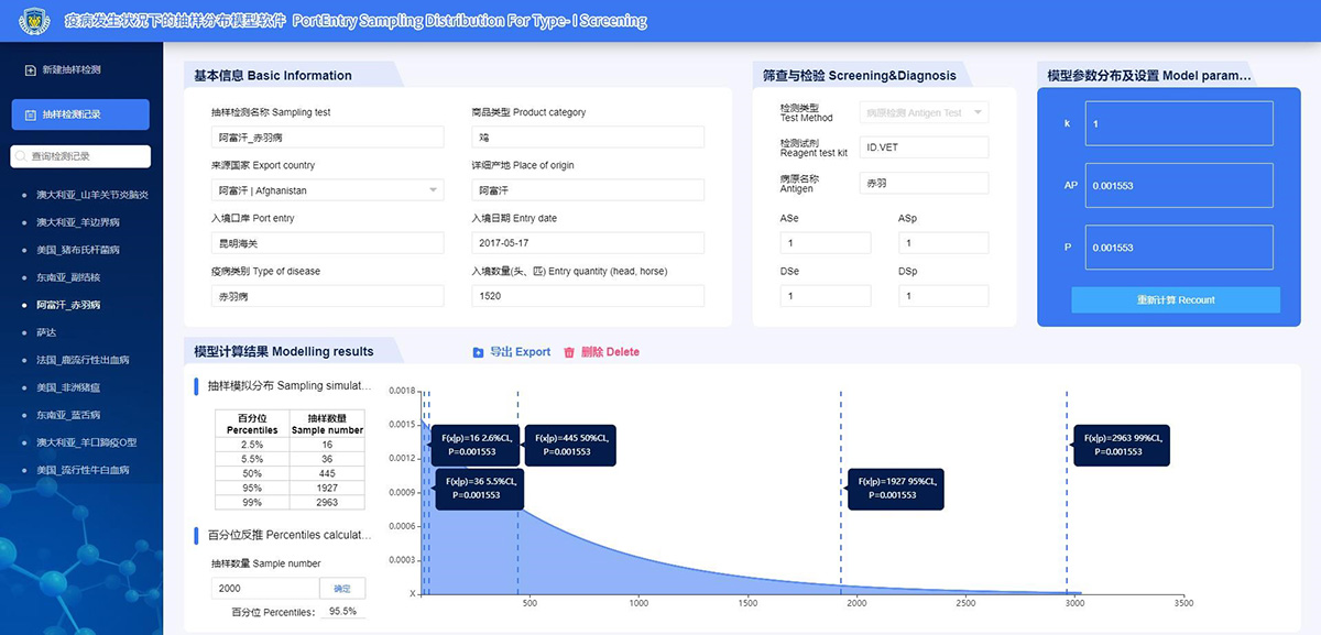本系統(tǒng)可廣泛應(yīng)用于動(dòng)物疫病抽樣檢測(cè)領(lǐng)域,尤其針對(duì)進(jìn)出口岸,不同國(guó)家和地區(qū)入境的物種來(lái)源地廣、數(shù)量透明且龐大、疫病發(fā)生的不確定性極高、入境畜群及其產(chǎn)品攜帶特定疫病的時(shí)間與空間連續(xù)性強(qiáng),系統(tǒng)可構(gòu)建抽樣檢測(cè)分布模型并對(duì)其進(jìn)行抽樣檢測(cè)分析。