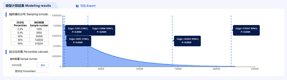抽樣檢測(cè)結(jié)果以可視化看板的形式展現(xiàn),包括百分位~抽樣數(shù)量關(guān)系表和關(guān)系曲線(xiàn)展示窗口,以及給定抽樣數(shù)量條件下百分位反推窗口。各抽樣要素值一目了然地展現(xiàn)于可視化界面上。同時(shí),系統(tǒng)還可以導(dǎo)出抽樣模型的詳細(xì)模擬結(jié)果,便于進(jìn)一步的分析研究。