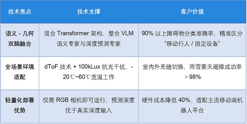 融合視覺(jué)語(yǔ)義理解與毫米級(jí)深度感知,實(shí)現(xiàn)從 “被動(dòng)避障” 到 “主動(dòng)預(yù)判” 的跨越。