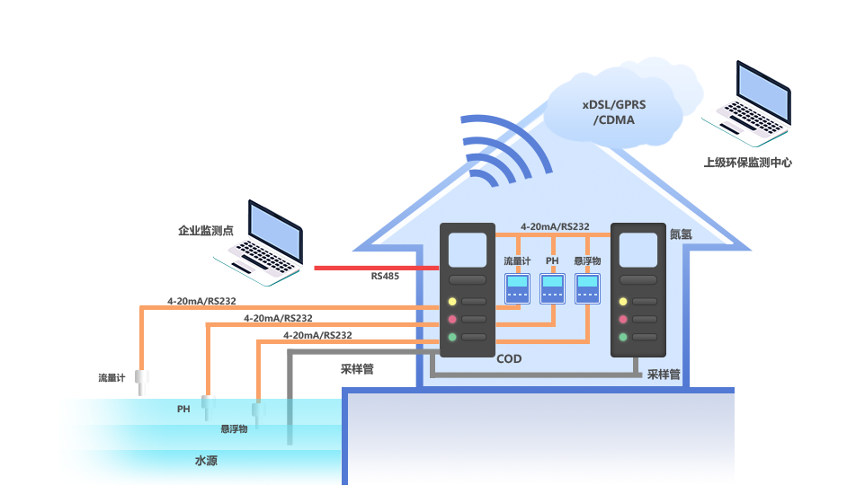 水污染源在線監(jiān)測系統(tǒng)由監(jiān)測子系統(tǒng)、采樣及預(yù)處理子系統(tǒng)、數(shù)據(jù)采集與處理子系統(tǒng)、監(jiān)視傳感子系統(tǒng)、監(jiān)測站房子系統(tǒng)、排放口建設(shè)子系統(tǒng)等組成。系統(tǒng)可監(jiān)測pH、COD、氨氮、總磷、總氮、流量等參數(shù),以及六價鉻、總鉻、鉛、鎘、汞、砷、銅、鋅、鎳及其他重金屬因子。